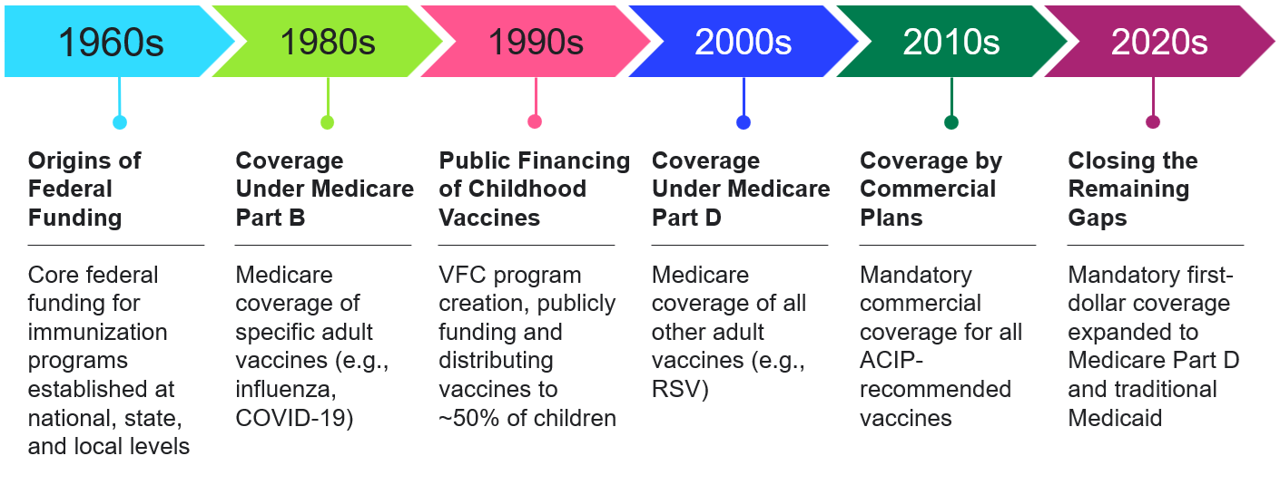Federal legislation has incrementally grown to require first-dollar coverage of ACIP-recommended vaccines for more insurance groups (Figure 1). This began with the Omnibus Budget Reconciliation Act in 1993, which tied inclusion in the Vaccines for Children Program to an ACIP resolution. In 2010, the Affordable Care Act requires commercial payers to cover all immunizations that have “in effect a recommendation” from the ACIP and further requires Medicaid expansion programs to cover ACIP-recommended products. These two pieces of legislation tied first-dollar coverage of vaccines for over two-thirds of the American population to ACIP recommendations. The remaining gaps in patient cost-sharing requirements were closed in 2022 with the passage of the Inflation Reduction Act, which eliminated all cost sharing for adult vaccines recommended by ACIP under Medicare Part D, and mandated that traditional Medicaid and CHIP plans cover all approved vaccines recommended by ACIP along with their administration without cost sharing. For more detailed information on US vaccine coverage requirements, see Avalere’s guidebook here.