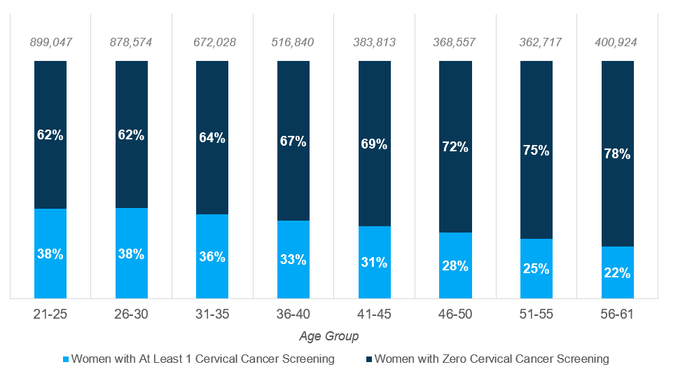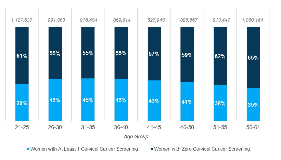 The analysis showed that about 38% of the approximately 12 million women in this sample received at least one cervical cancer screening. Less than half of women with commercial insurance (41%) and even fewer with Managed Medicaid (33%) insurance received at least one cervical cancer screening during the five-year period (see Figure 1).