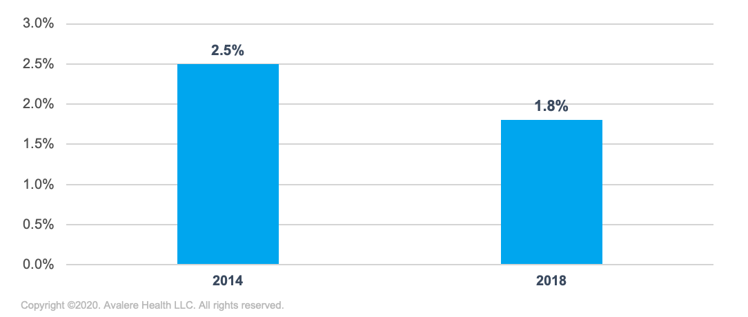 Avalere also examined the share of prescriptions filled for the cohort of branded drugs in the analysis that received charitable assistance (Figure 1). In 2014, 2.5% of the prescriptions filled for this cohort were provided with charitable assistance. In 2018, however, a smaller share of prescriptions—1.8%—received charitable assistance.