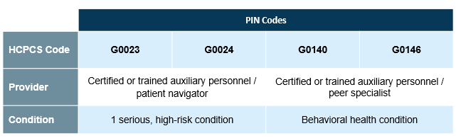 As a part of the Calendar Year 2024 Medicare Physician Fee Schedule, the Centers for Medicare and Medicaid Services established Healthcare Common Procedure Coding System (HCPCS) Level I codes, also known as CPT® codes, to describe Principal Illness Navigation (PIN) services (Figure 2). PIN services include those that help patients diagnosed with high-risk conditions like cancer to identify and connect with appropriate clinical and support resources. These services are provided by certified or trained auxiliary personnel (e.g., patient navigator, certified peer specialist) and under the general supervision of a physician or other practitioner. These codes became effective January 1, 2024.