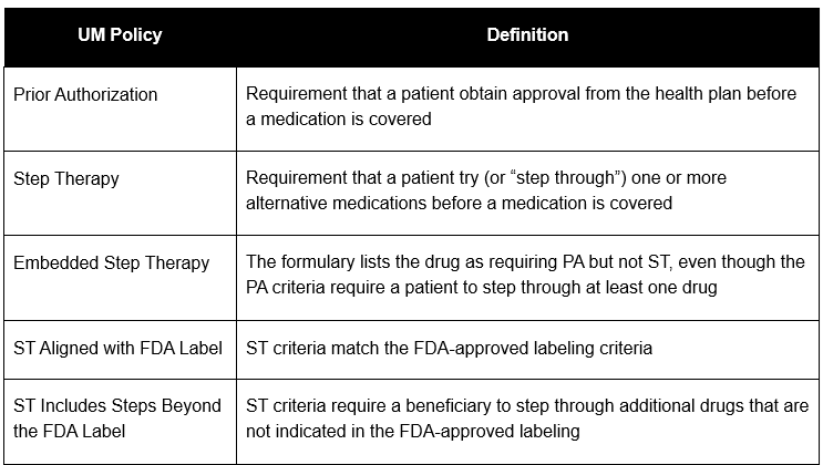 Avalere Health analyzed UM patterns in commercial plan pharmacy benefit coverage for branded, single-source drugs indicated to treat three conditions: psoriatic arthritis (PsA), multiple sclerosis (MS), and chronic myelogenous leukemia (CML) (UM policy definitions are provided in Table 1). Avalere Health conducted a previous analysis of the use of step therapy for specific drug indications across Medicare Part D.