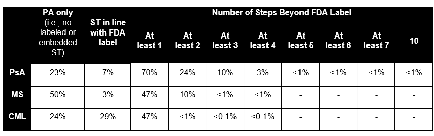 - For PsA drugs, ST beyond the FDA-approved labeling is required 63% of the time