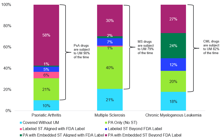 - Plans apply ST beyond the FDA label less frequently for MS and CML—37% and 39% of the time, respectively