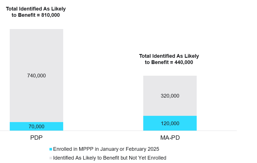 Early data for 2025 indicates that a small portion (15%) of the beneficiaries who were flagged as likely to benefit from the MPPP have enrolled in the program. As of the end of February 2025, Part D Drug Event (PDE) data shows that only about 190,000 beneficiaries who filled a script in January or February 2025 were enrolled in the MPPP, including about 70,000 PDP and 120,000 MA-PD beneficiaries (Figure 1).