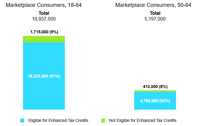 If the ACA marketplace enhanced premium tax credits are made permanent, nearly 5 million people ages 50–64 will be eligible to receive premium subsidies in 2026.In 2024, 18.9 million people ages 18–64 enrolled in health insurance plans through federal and state-based marketplaces, of which 4.9 million were between the ages of 50 and 64. The vast majority (17.3 million of those ages 18–64, including 4.5 million adults ages 50–64) received enhanced premium tax credits to help cover their health insurance premiums. By 2026, the number of individuals estimated to receive enhanced premium tax credits is forecast to grow to more than 18 million, of which 4.8 million are expected to be ages 50–64. The enhanced premium tax credits, however, are set to expire at the end of 2025 if Congress does not extend them. Without an extension of the enhancements, these 18 million Americans who are expected to benefit from the enhancements will be left with fewer and potentially no tax credits to purchase private health insurance on the marketplaces.
