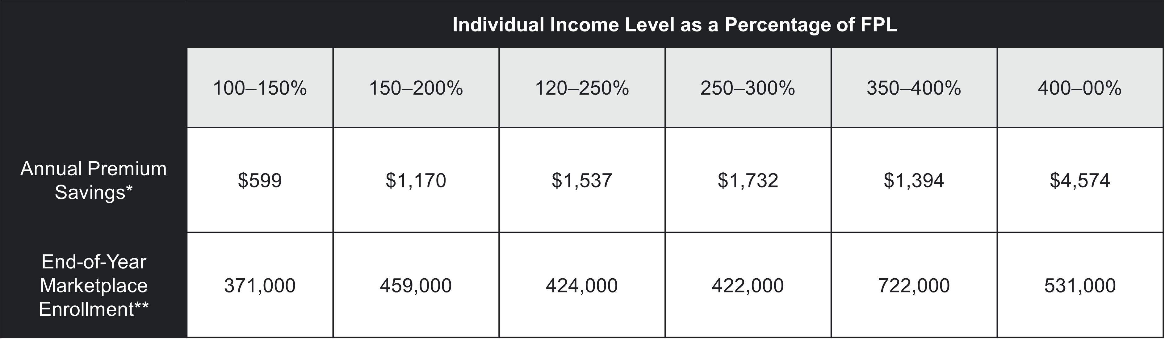 Table 1: Estimated Annual Premiums Savings and Enrollment, Ages 50–64 by Income Level, 2026