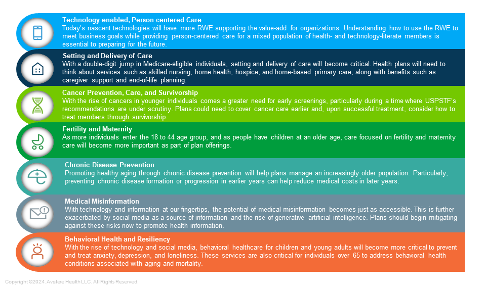 In 2030, technologies that are nascent today, such as wearables and remote monitoring will be more established and either show their value or disappear. Providers, health plan, and patients will more seamlessly incorporate the technologies that gain a foothold into their healthcare approaches in a way that customizes health for each unique individual. With that, today’s generalized clinical programs will be less effective. Health plans need to evolve operations, practices, and clinical models today to prepare for future shifts and better provide true person-centered, individualized care (Figure 2).