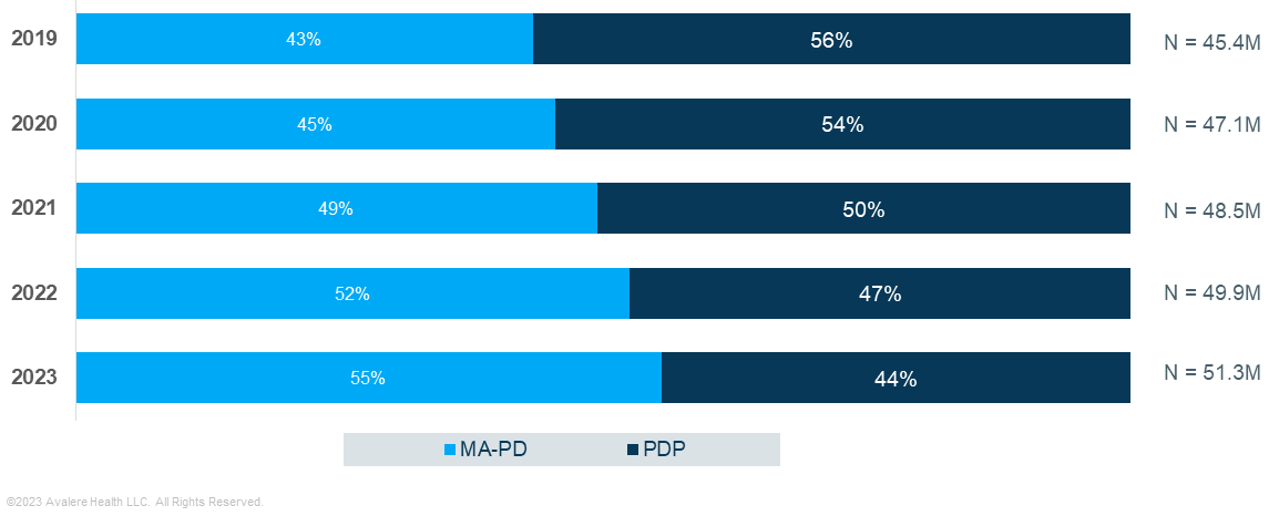 Enrollment in MA-PDs has grown considerably in the past few years, with MA-PDs now comprising approximately 55% of all Part D enrollment (Figure 2). This continued enrollment growth impacts the Center for Medicare and Medicaid’s (CMS) subsidy payments to plans, since the Part D direct subsidy is calculated based on an enrollment-weighted average of Part D plan bids.