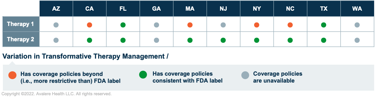 For the 2 innovative therapies researched across the 10 states, Avalere found that many states have either not published formal FFS coverage policies or implement coverage policies that are more restrictive than the FDA label. States’ approaches to developing coverage policies also varied depending on each therapy. Specifically, 4 states (AZ, GA, NJ, and WA) have not published formal FFS coverage policies for at least 1 of the innovative therapies researched. Of the 6 states where coverage policies were available, 4 (CA, MA, NY, and NC) had policies that were more restrictive than the FDA label for at least 1 of the innovative therapies (Figure 1).