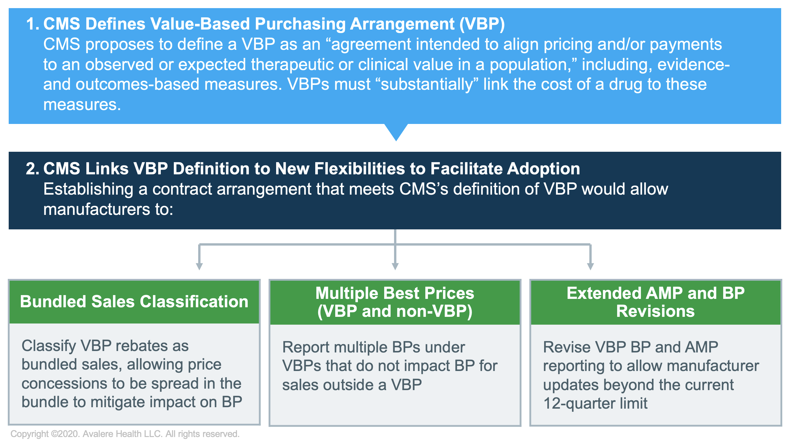 How will CMS define VBP and how prescriptive will the definition be? CMS’ proposed definition of VBP leaves the key term “substantial” undefined. It is not clear whether CMS means that a substantial portion of the drug cost must be tied to its performance or that a substantial part of all rebates must be tied to performance under a VBP arrangement. Additionally, the types of performance metrics that would be considered “evidence-based” or “outcomes-based” are not fully defined, and could open the door to the use of value frameworks or other constructs to define “substantial” value in VBP. More broadly, it is worth contemplating if CMS will be more prescriptive in finalizing the rule or if these definitions will be left to stakeholder discretion.