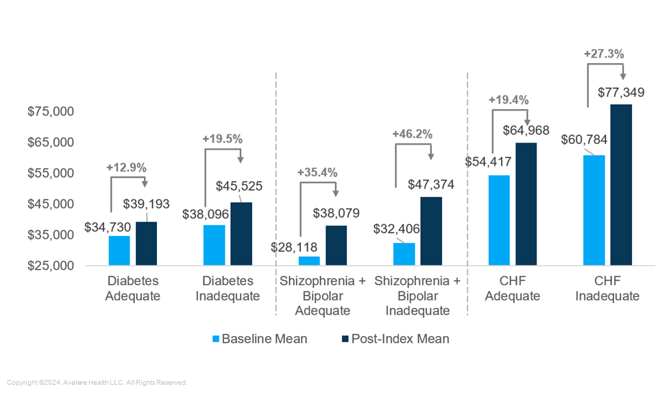 Another Avalere analysis focused on MDD, a serious mental health condition characterized by a persistent and intense feeling of sadness or a lack of interest in external stimuli that impacts daily functioning and quality of life. Avalere’s analysis demonstrated significant increases in medical expenditures for patients with comorbidities when those patients did not receive adequate mental healthcare for MDD.
