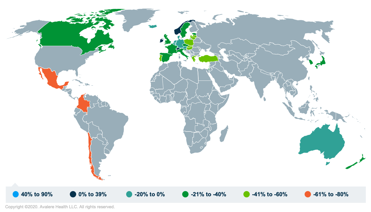 Key questions about the MFN proposal are around the use of GDP not only to determine target countries but also in adjusting prices. To attempt to develop a methodology for adjusting international prices by the relative differences between the US and OECD per-capita GDPs, Avalere determined the percentage change that would be required to align a country’s per-capita GDP with that of the US.