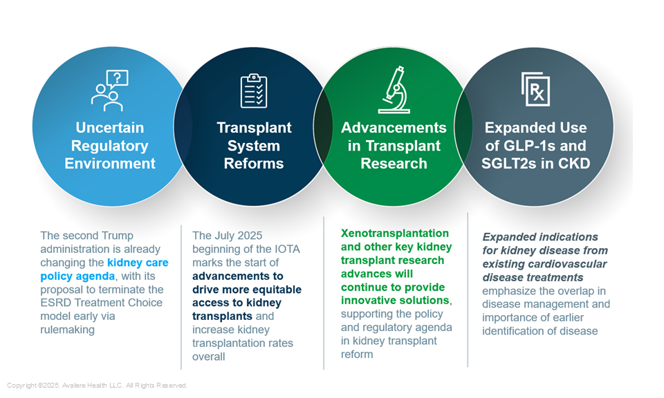 Political changes, transplant system reforms, research advancements, and expanded CKD indications create opportunities and challenges in the kidney care space.Avalere experts have identified four major themes in the policy, regulatory, and market landscape to monitor for the remainder of 2025.