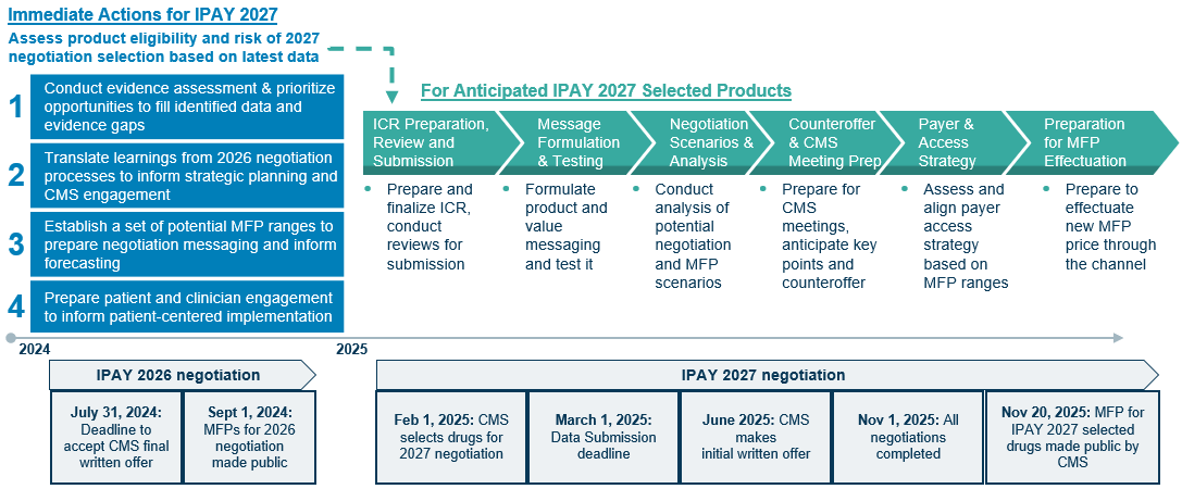 Manufacturers anticipating potential selection or therapeutic impact for 2027 Medicare negotiations should begin preparations and align internal decision-making, applying learnings from Year 1.The Medicare negotiation process for the first 10 Part D drugs selected for Medicare drug price negotiation for initial price applicability year (IPAY) 2026 is well underway. Manufacturers of selected products for Year 1 are in active negotiation discussions with the Centers for Medicare and Medicaid Services (CMS) following the delivery of initial written offers on February 1, 2024. Since the agency rejected all 10 counteroffers, the IPAY 2026 guidance allows for direct meetings with manufacturer through August 1, 2024, with CMS publishing the maximum fair prices (MFPs) for Year 1 products by September 1.