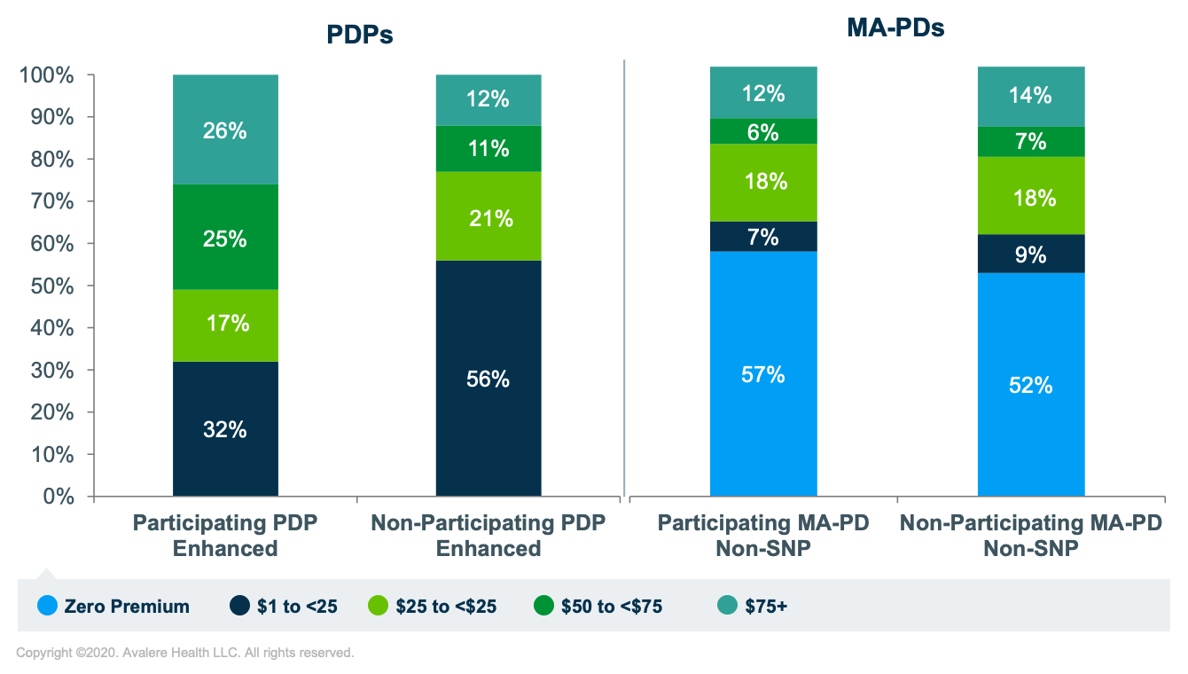 Premiums vary by plan type. The average enrollment-weighted monthly premium3 enhanced PDPs is $23.46 more for participating versus non-participating plans ($57.53 versus $34.07). For MA-PD plans, the average enrollment-weighted premium for MA-PD plans is $10.36 less for participating versus non-participating plans ($22.74 versus $33.10).