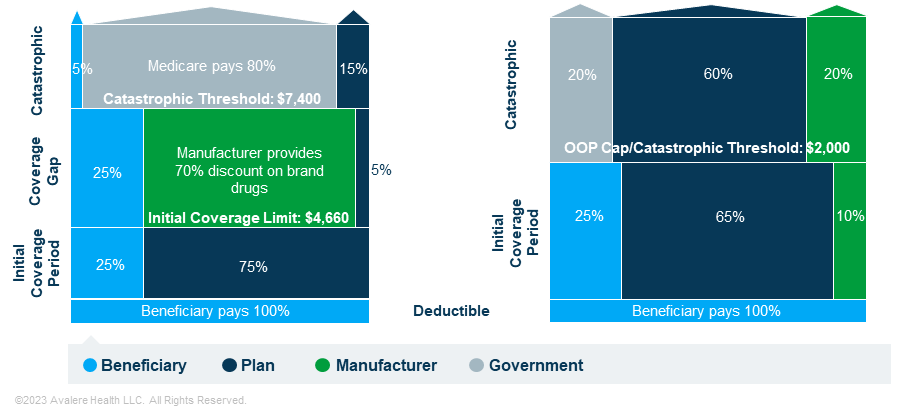 Note: Reflects benefit design for applicable drugs (i.e., brand drugs, biologics, biosimilars). Standard benefit in 2023 applies to non-low-income subsidy (LIS) enrollees only. Benefit design beginning in 2025 applies to both non-LIS and LIS enrollees.
