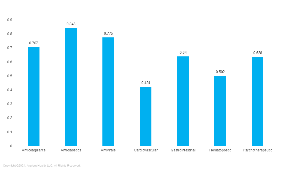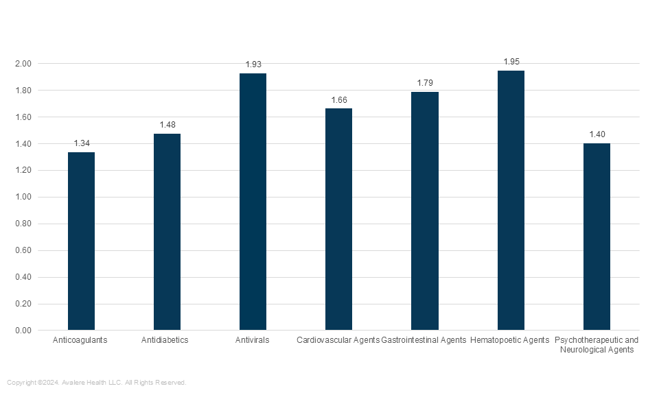 Avalere found that average risk scores were higher for beneficiaries who took hematopoietic (blood cell formation) agents than they were for beneficiaries not taking hematopoietic agents. Similarly, they were higher for beneficiaries taking antivirals and gastrointestinal agents. While still above 1, risk scores were lower for beneficiaries taking anticoagulants or psychotherapeutic agents (Figure 2).