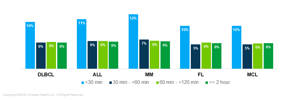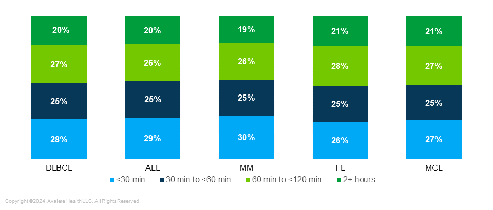 Differences in Indications by Proximity to Treatment Center: Proximity to treatment centers was consistent across all five indications, with the greatest variations in the <30 minute range and the 60–120 minute range. Notably, more than 50% of patients in every indication live within one hour of a cell therapy treatment site (Figure 1).