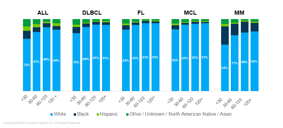 Differences in Race/Ethnicity by Proximity to Treatment Center: When comparing patients across indications, there was a higher percentage of non-White patients diagnosed with MM and ALL, particularly in the cohort less than 30 minutes from a treatment site (Figure 2).