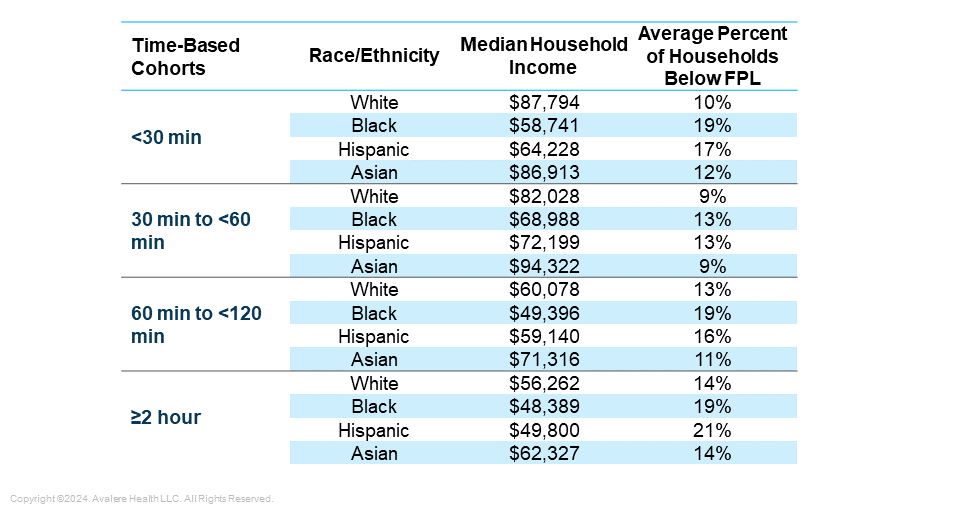 Avalere found persistent trends across all five conditions showing that patients living nearest to a treatment site were disproportionately likely to be Black or Hispanic compared to the patient population further from a treatment site. Additionally, patients living in areas nearest to treatment sites had lower levels of vehicle ownership and fewer adults per household. Income data showed differences between earnings for White individuals and Black or Hispanic individuals, demonstrating that “need” cannot be easily defined based on proximity to a treatment site and therefore novel forms of support could be necessary.