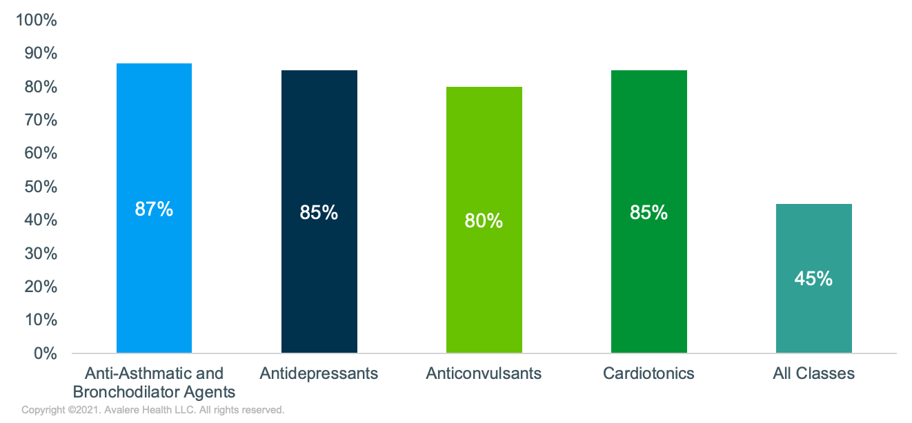 This occurrence was concentrated in certain classes of drugs, with a relatively high proportion of patients paying the full cost of at least one generic drug fill in 4 therapeutic classes (Figure 1). For example, nearly 90% of beneficiaries paid the full cost of generic anti-asthmatic and bronchodilator agents placed on the preferred-brand tier.