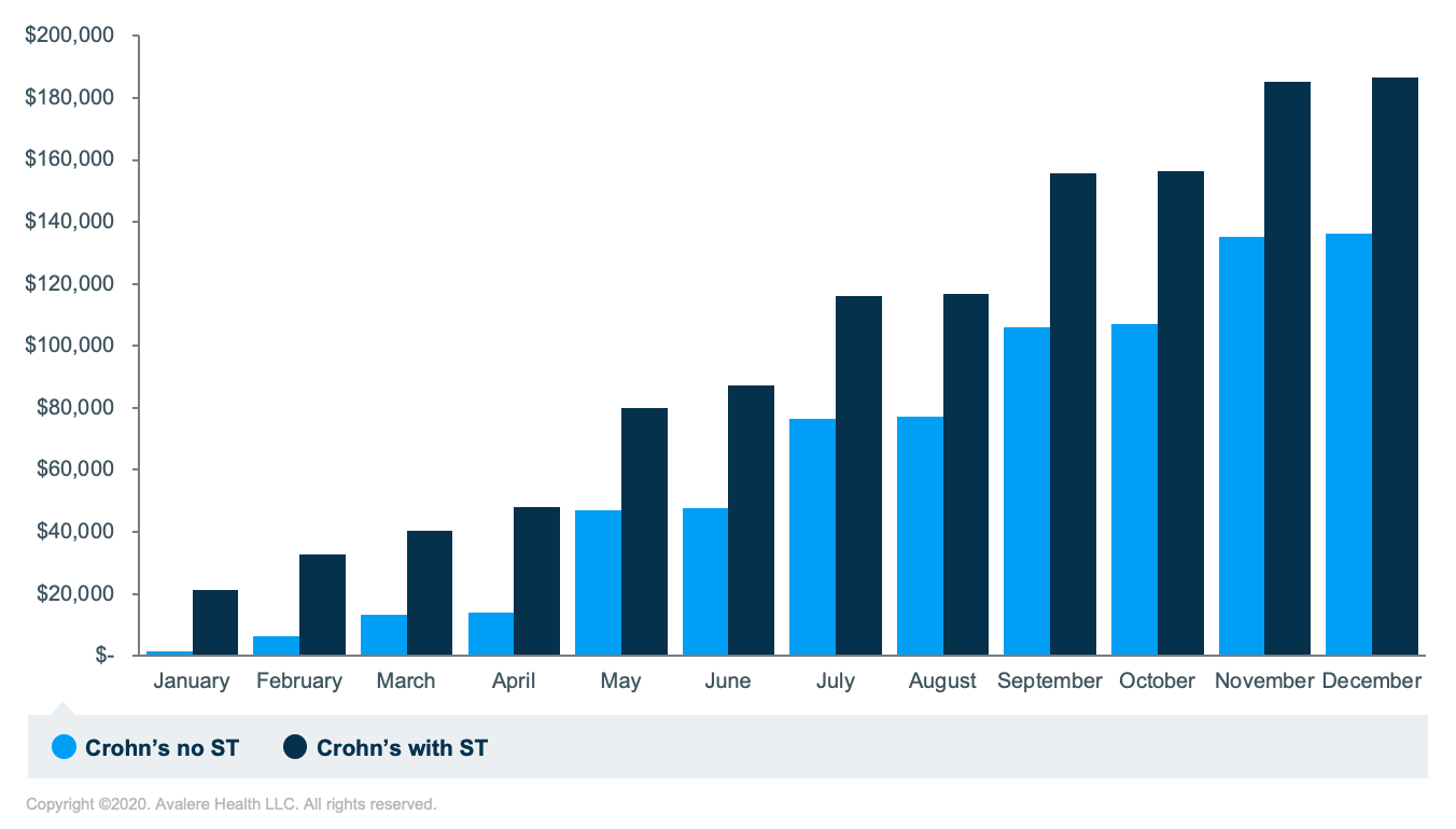 This analysis found that a hypothetical patient with Crohn’s disease and no step therapy did not hit the MOOP until December, therefore having OOP costs spread out over 12 months with average monthly OOP of $339. In comparison, a hypothetical Crohn’s patient with step therapy and a negative outcome hit the MOOP in May, resulting high upfront OOP liability of just over $4000 concentrated within the first 5 months of the plan year. In both scenarios, the patient incurred $4,065 in total OOP costs, the plan’s MOOP (Figure 1).
