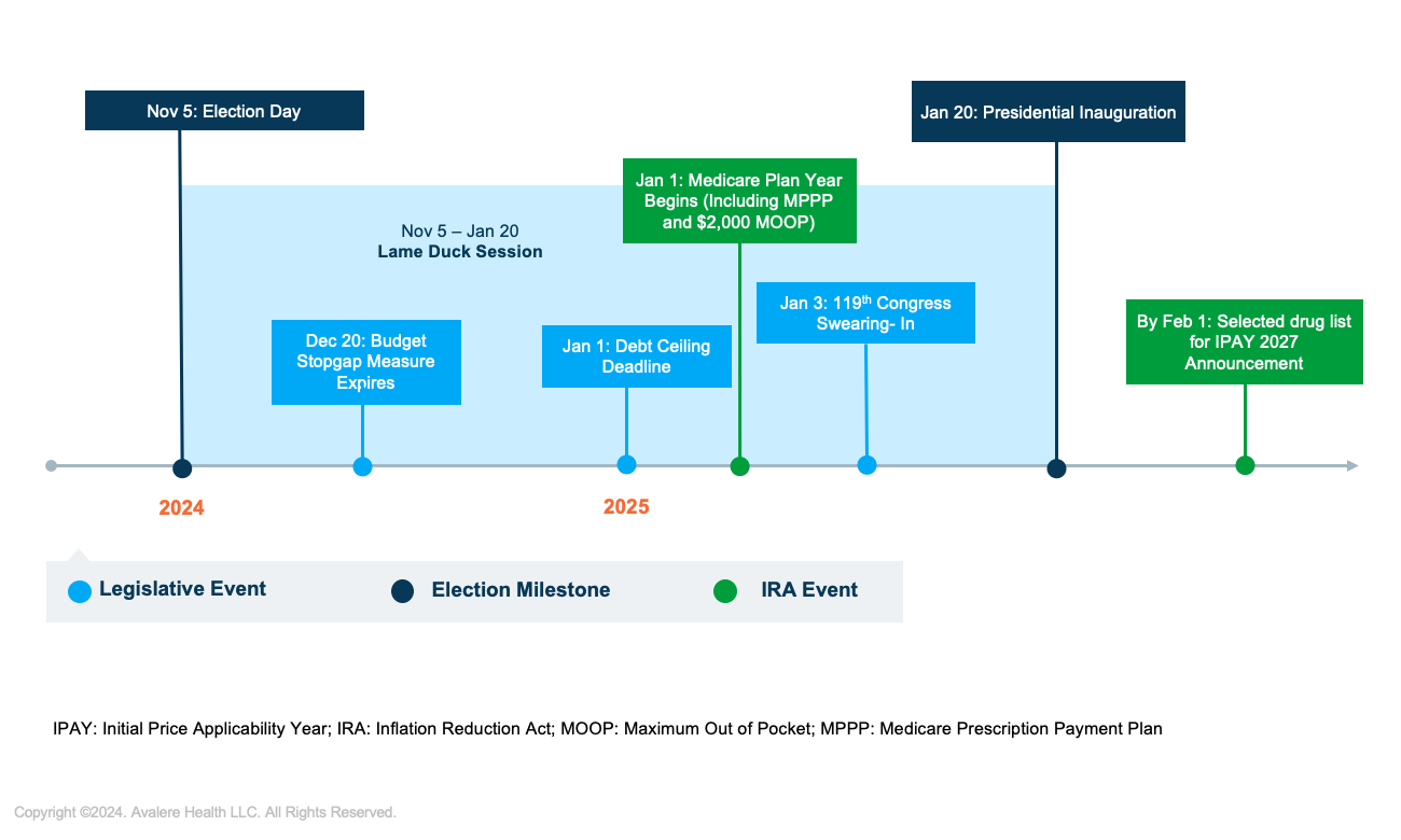 Given the changed makeup of Congress heading into 2025, the 118th Congress is not likely to pursue significant legislation in the lame duck session between now and inauguration, instead punting many issues to the 119th Congress, such as reforms to pharmacy benefit managers (PBMs) and the 340B drug pricing program. However, the current Congress will need to address the government funding stopgap measure, which expires on December 20, by reaching agreement on the 12 proposed appropriations bills. They will either pass an omnibus spending bill or push the negotiations to the next Congress and administration with another continuing resolution, with the latter being the most likely outcome.